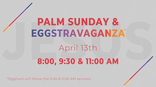 - PALM SUNDAY & EGGSTRAVAGANZA (APRIL 13 | 8:00, 9:30, 11:00 AM): Kids Ministry provided for 5th Grade and under as well as Nursery for all children under three.